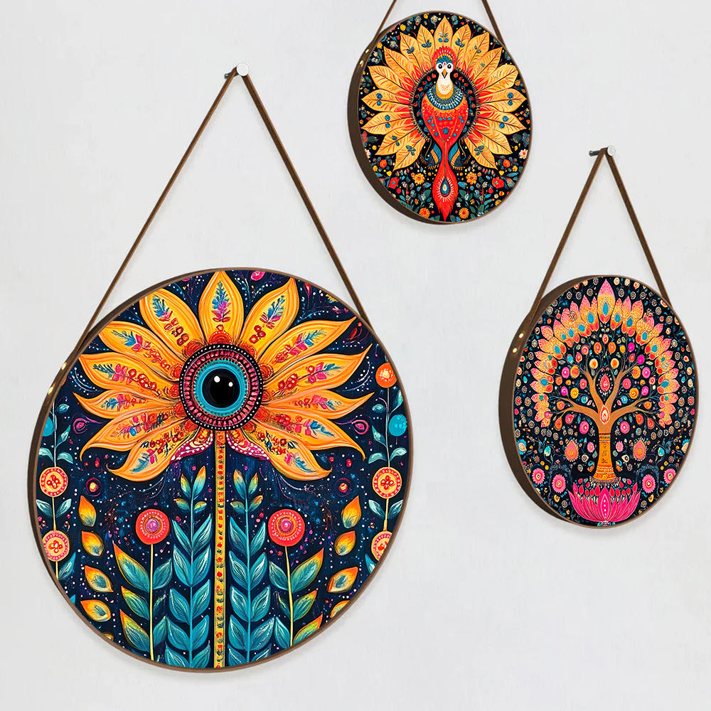 Traditional Madhubani Art Round Framed Canvas Wall Paintings - Set of 3