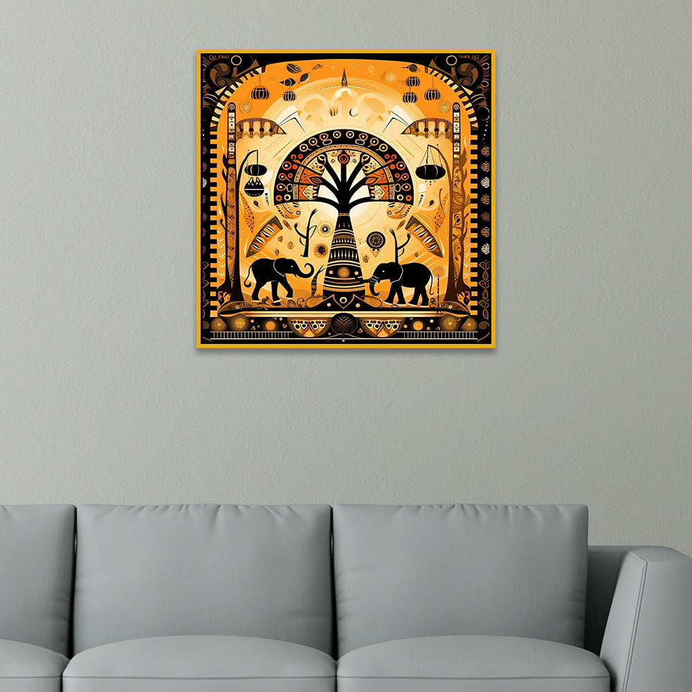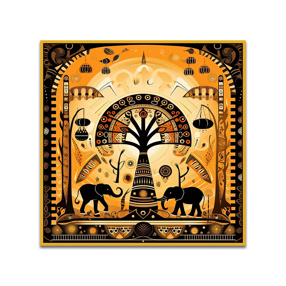Warli-Inspired Elephant Artwork Tribal Tree of Life Canvas Wall Painting