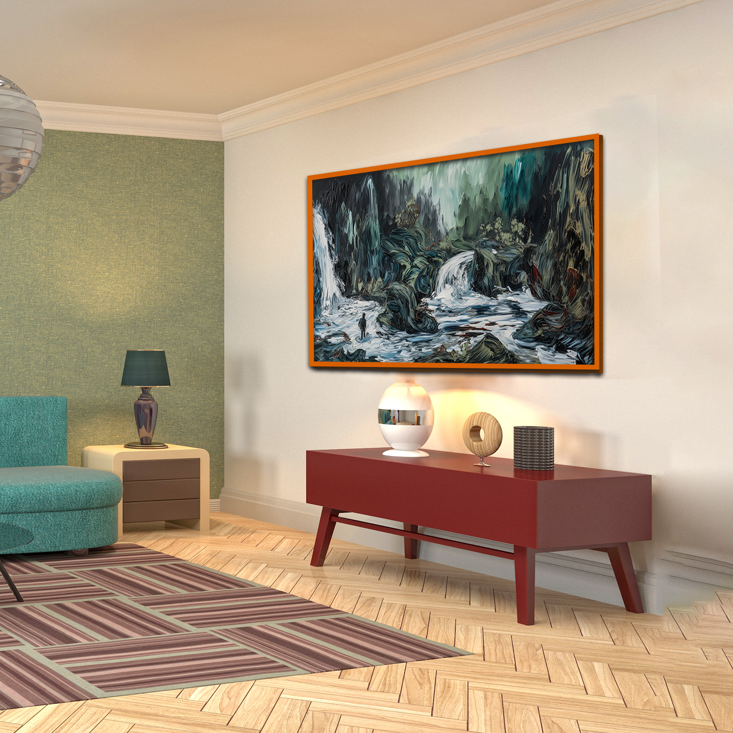 Beautiful Waterfall with Green Background Black White Painting Waterfall Canvas Wall Paintings