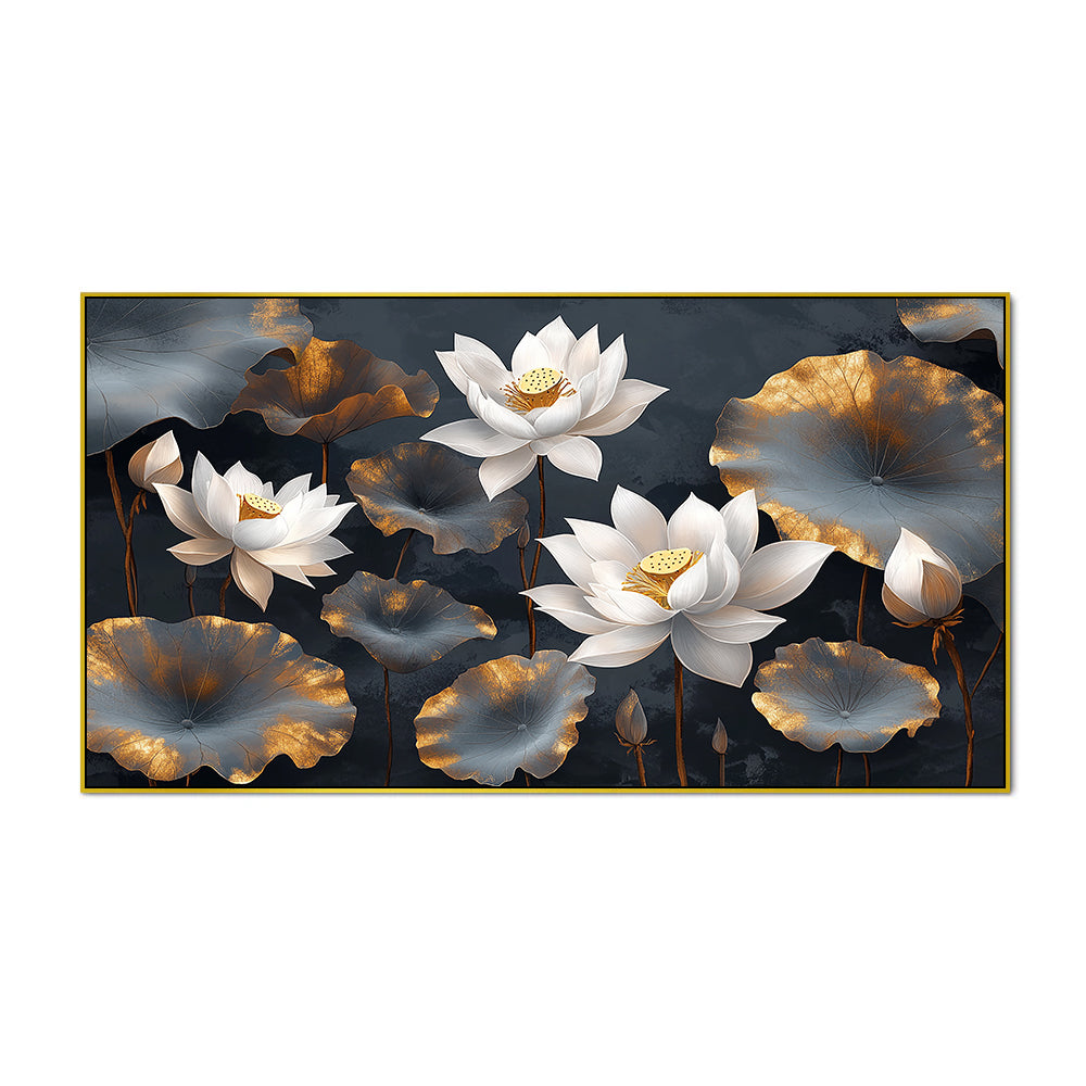 White and Golden Lotus Digital Printed Floral Canvas Wall Painting